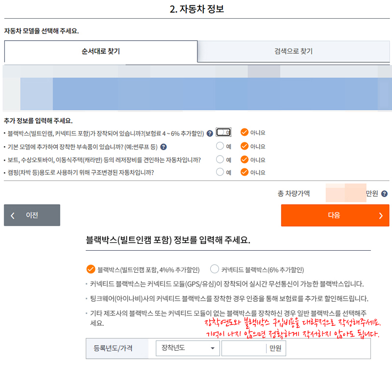 요즘은 대부분의 차량에 블랙박스가 장착되어 있으니 블랙박스 항목에 "예" 를 선택하세요.
