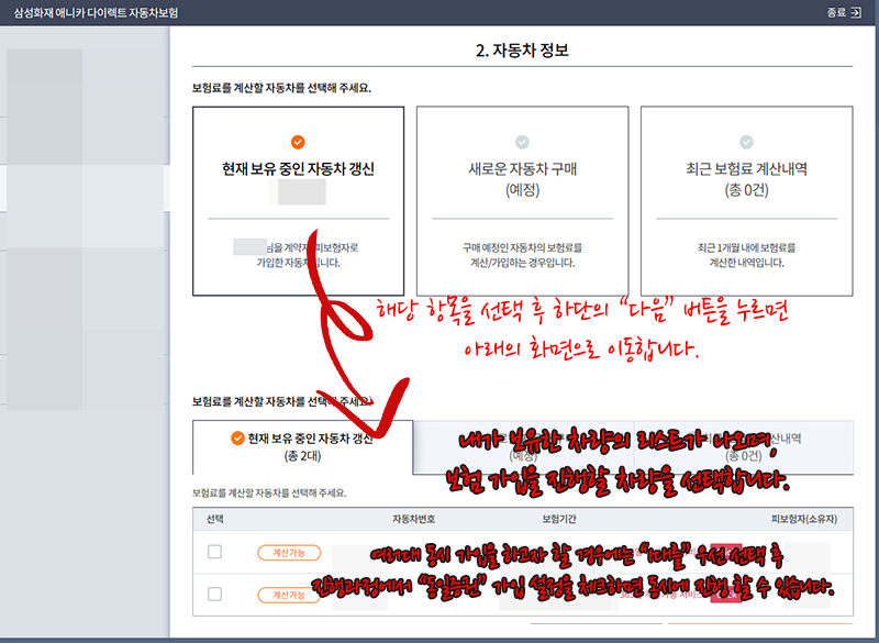 2) 본인 확인 후 내가 보유한 차량중에서 보험가입 할 차량 선택
