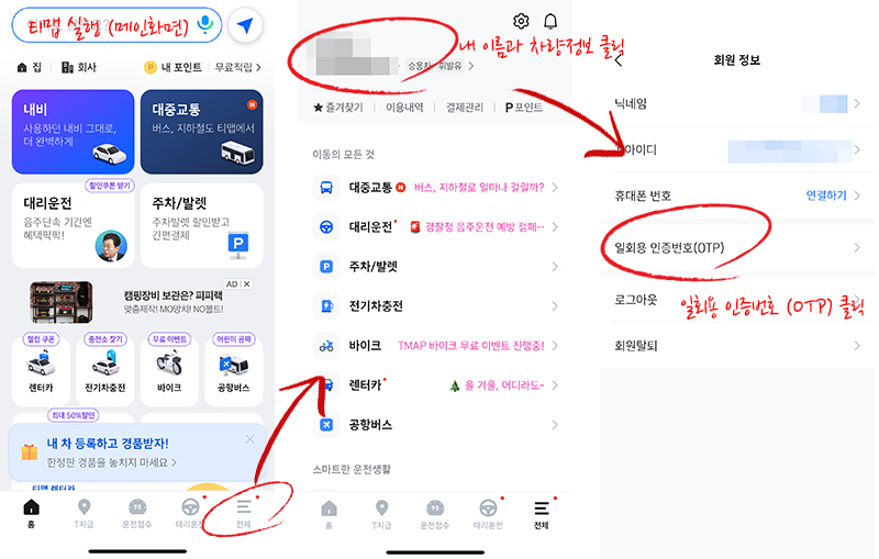 티맵 실행 -> 메인화면에서 전체 메뉴 접속 -> 상단의 "내이름과 차량정보" 클릭하여 회원정보 접속 -> OTP 확인