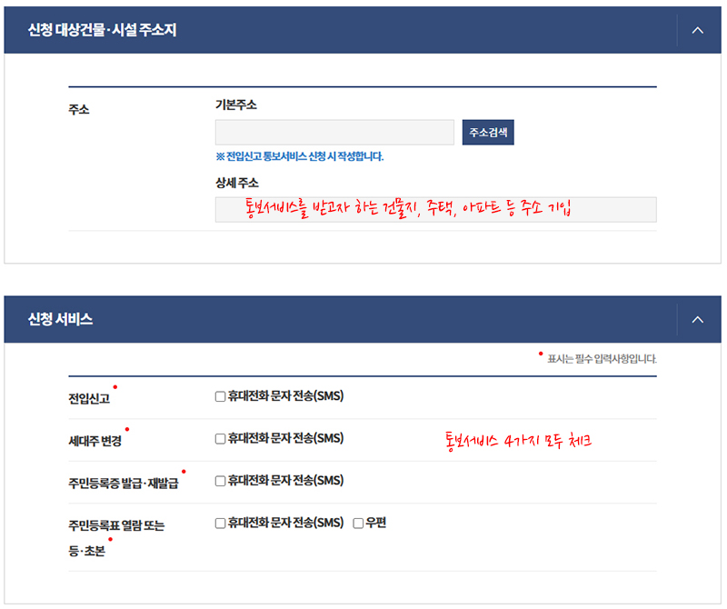 - "전입신고, 세대주변경, 주민등록증발급/재발급, 주민등록표 열람 또는 등/초본" 에 대한 4가지 통보 서비스를 모두 신청