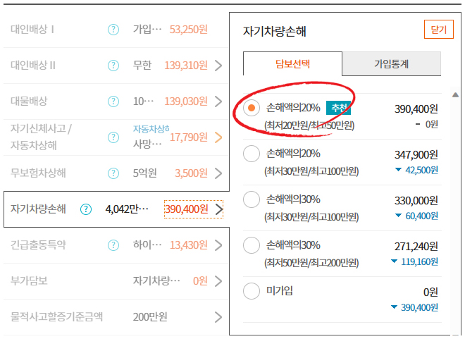 가급적 자차 금액의 100%를 설정하여 가입하는 것을 추천(기본 추천 그대로 설정 추천)
