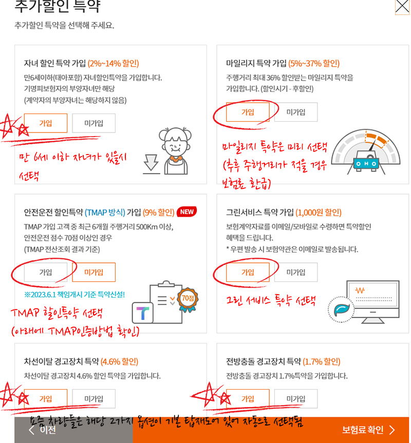 다음 순서는 추가할인 특약 설정으로 최대한 할인이 가능하도록 설정해야 합니다.