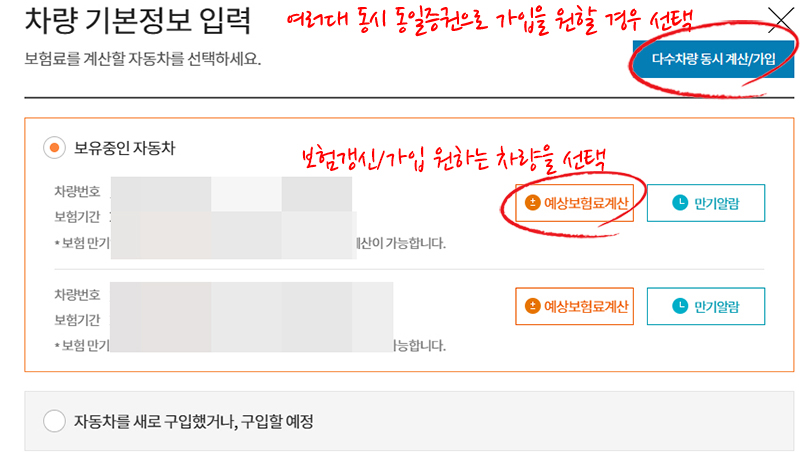 여러대를 동시 동일증권으로 가입을 원할 경우 "다수차량동시계산/가입" 을 선택합니다.