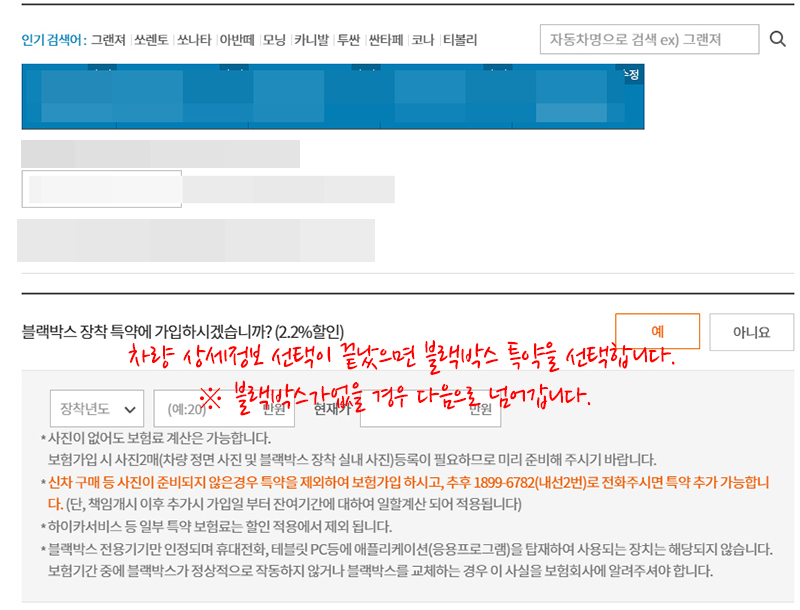 차량 상세정보를 입력했으면 블랙박스 특약을 선택해서 보험료 할인을 받도록 합니다.